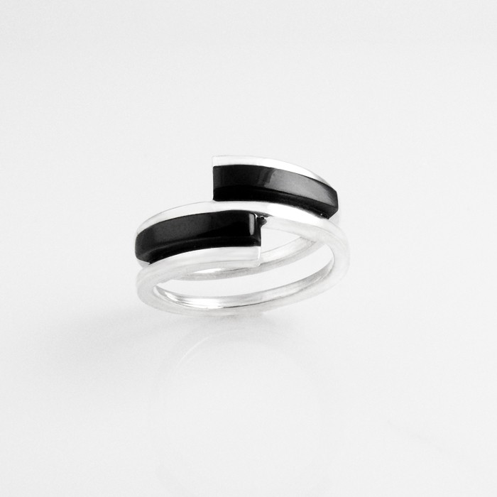 Anillo de plata de ley y azabache hecho a mano. Dimensiones: 1.5 cm de ancho. Peso aproximado: 3.9 g.