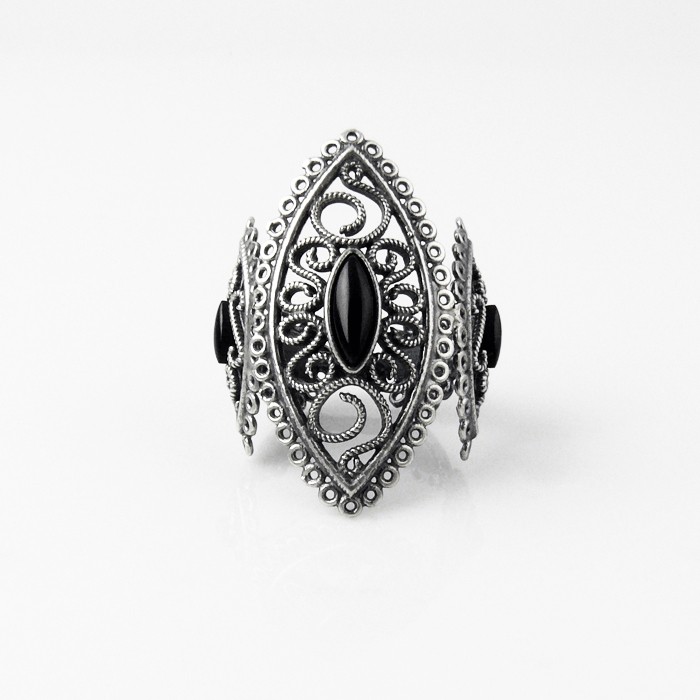 Anillo en plata de ley y azabache. Dimensiones: 3.3 cm de ancho. Peso aproximado: 6.1 g.