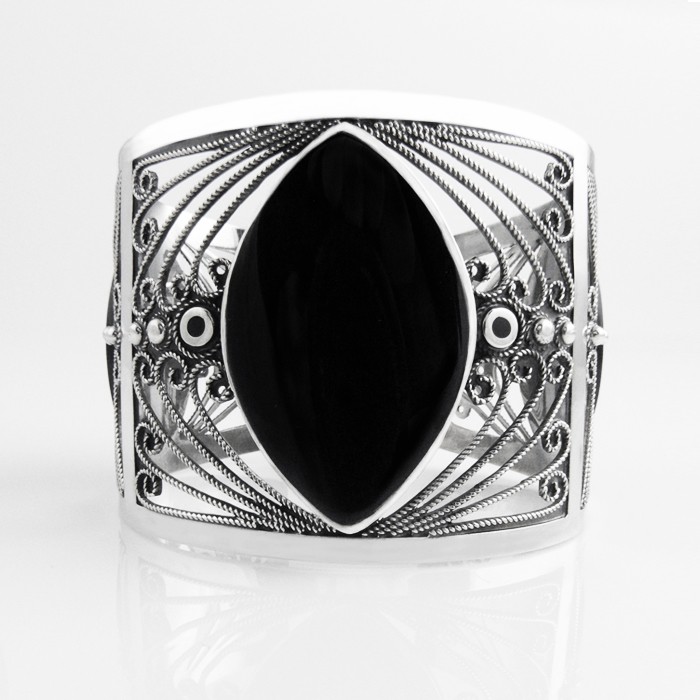 Brazalete de plata y azabache hecho a mano. Dimensiones: 5.4 cm de ancho x 6.6 cm de diámetro. Peso aproximado: 55.9 g.