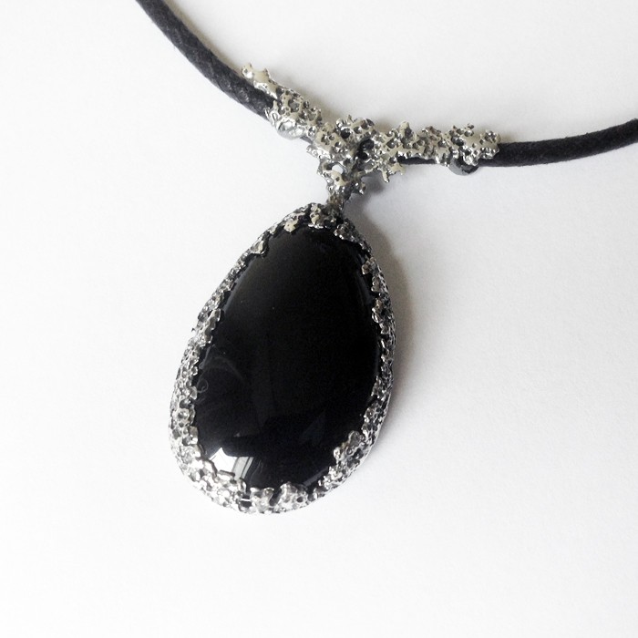 Sterling silver and jet necklace with a 42 cm long leather cord and silver clasp. Dimensions: 2.1 cm in width x 4.7 cm in length. Approximate weigth: 10.4 g.