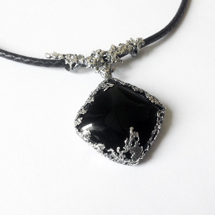 Sterling silver and jet necklace with a 42 cm long leather cord and silver clasp. Dimensions: 2.7 cm in width x 3.5 cm in length. Approximate weigth: 9 g.