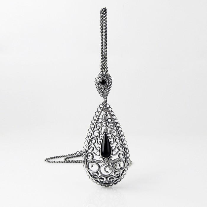 Colgante en plata de ley y azabache con cadena de plata de 62 cm de largo. Dimensiones del colgante: 3 cm de ancho x 7.5 cm de alto. Peso aproximado: 18 g.