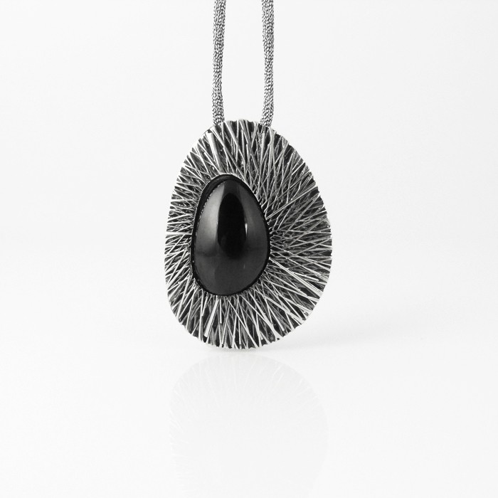 Gargantilla de plata de ley y azabache con cordón de seda sintética de 43 cm de largo y terminales de plata. Dimensiones del colgante:  3.9 cm de ancho x 4.8 cm de largo. Peso aproximado: 20.1 g.