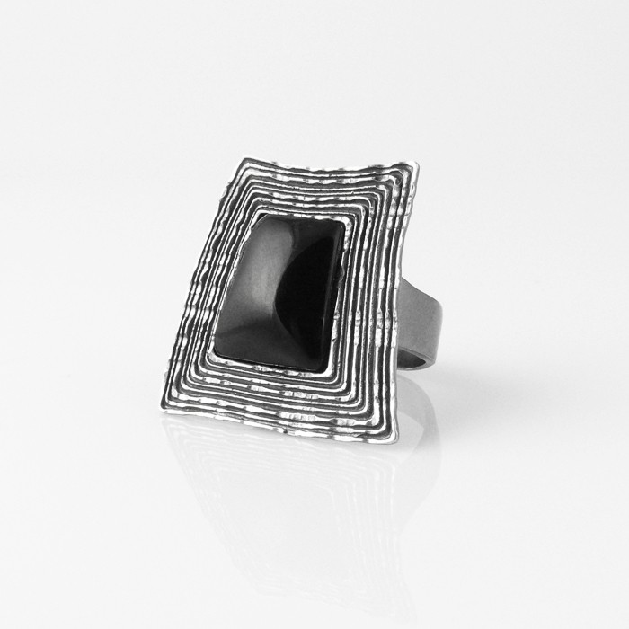 Sterling silver and jet ring. Dimensions of the motif: 2.5 cm in width x 2.8 cm in length. Approximate weight: 9.9 g. Available in different sizes.