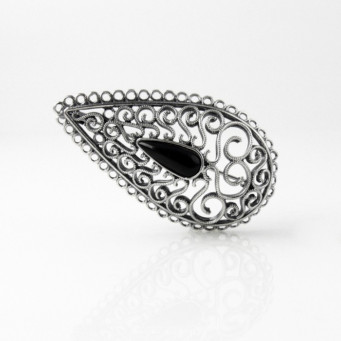 Sterling silver and jet brooch. Dimensions: 3 cm in width x 5.5 cm in length. Approximate weight: 11.1 g.