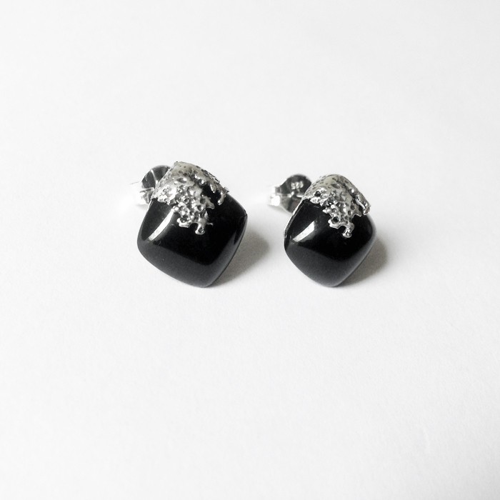 Sterling silver and jet earrings clasped by a butterfly nut at the back. Dimensions: 1 cm in width x 1.4 cm in length. Each earring approximate weigth: 1.2 g.