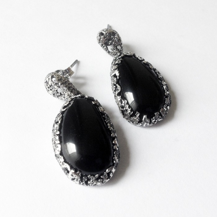 Sterling silver and jet earrings clasped by a butterfly nut at the back. Dimensions: 1.7 cm in width x 3.6 cm in length. Each earring approximate weigth: 5.2 g.