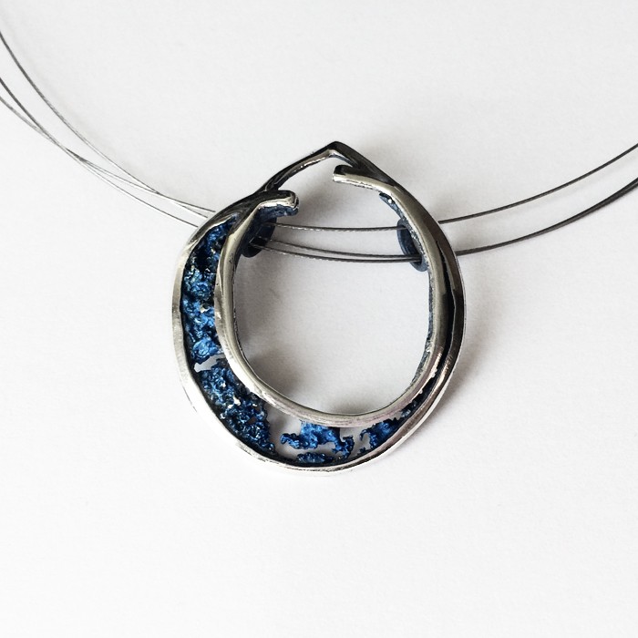 Sterling silver and natural pigments pendant with a 42 cm long three-strand steel cord with silver clasp. Dimensions of the pendant: 3 cm in diameter. Approximate weight: 5.5 g.