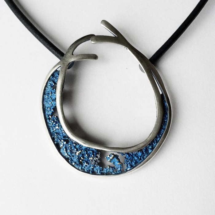 Sterling silver and natural pigments pendant with a 42 cm long leather cord with silver clasp. Dimensions of the pendant: 5.3 cm in diameter. Approximate weight: 17.2 g.
