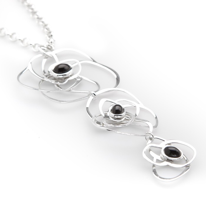 Sterling silver and jet pendant with 81 cm long silver chain. Pendant dimensions: 5.6 cm in width x 13.2 cm in length. Approximate weight: 49.1 g.