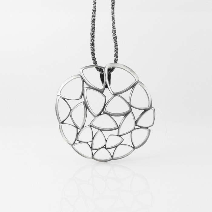 Sterling silver necklace with a 43 cm long synthetic silk cord and silver clasp. Pendant dimensions: 6 cm in diameter.