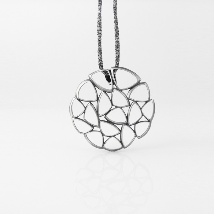 Sterling silver necklace with a 43 cm long synthetic silk cord and silver clasp. Pendant dimensions: 3 cm in diameter.