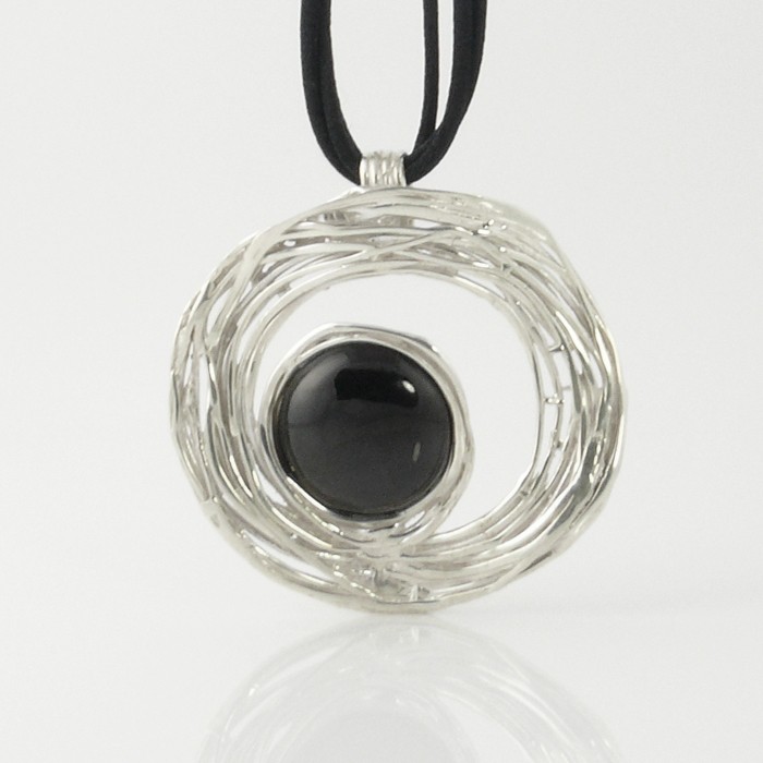 Sterling silver and jet necklace with a 49 cm long synthetic silk three-string cord and silver fastener. Pendant dimensions: 6.5 cm in diameter. Approximate weight: 41.5 g.