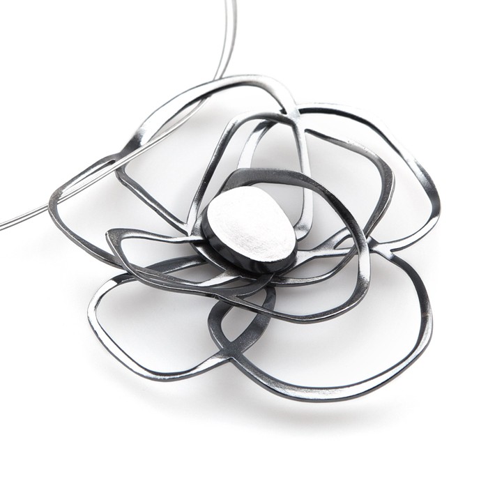 Sterling silver necklace with a 43 cm long three-strand-steel cord and silver clasp. Pendant dimensions: 7 cm in diameter. Approximate weight: 17.7 g.