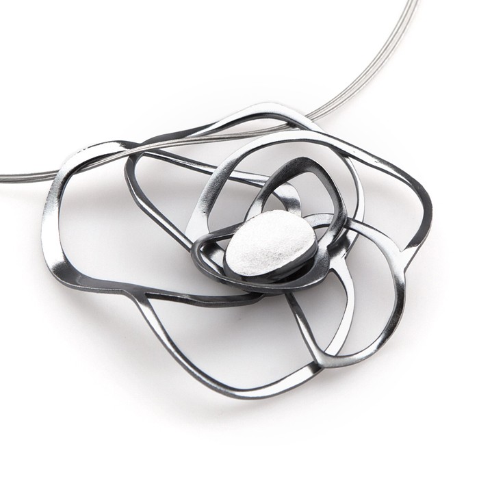 Sterling silver necklace with a 43 cm long three-strand-steel cord and silver clasp. Pendant dimensions: 5.5 cm in diameter. Approximate weight: 11.8 g.