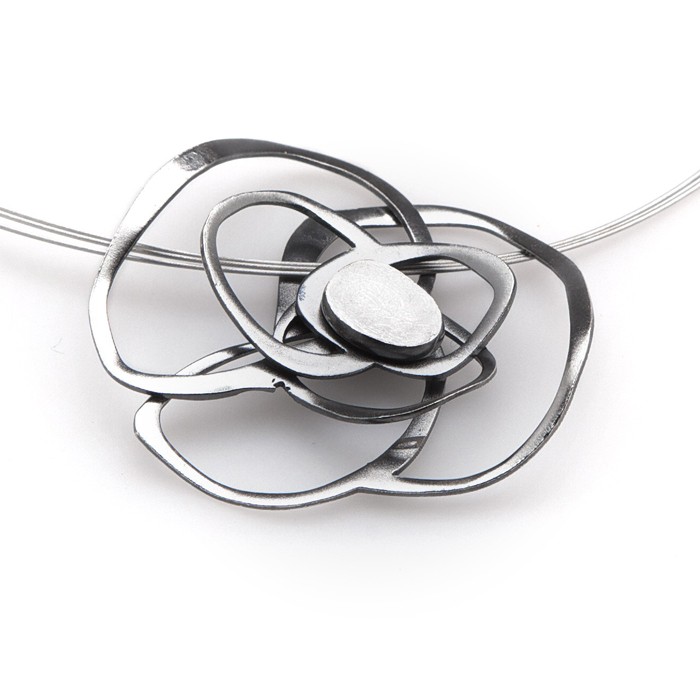 Sterling silver necklace with a 43 cm long three-strand-steel cord and silver clasp. Pendant dimensions: 4.5 cm in diameter. Approximate weight: 9.0 g.