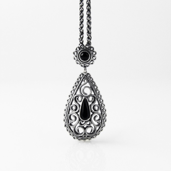 Sterling silver and jet necklace with a 43 cm long silver chain. Dimensions of the pendant: 1.8 cm in width x 3.8 cm in length. Approximate weight: 8.2 g.