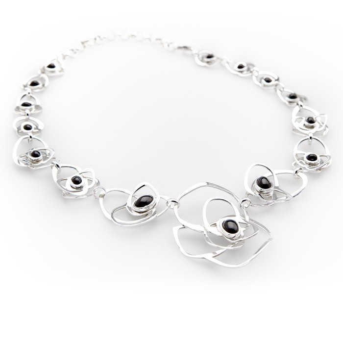 Sterling silver and jet necklace. Dimensions: 4.5 cm in width x 45.8 cm in length. Approximate weight: 41.9 g.