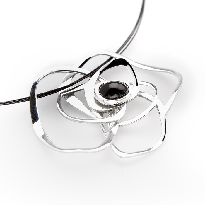 Sterling silver and jet necklace with a 43 cm long three-strand-steel cord and silver clasp. Pendant dimensions: 4.5 cm in width x 3.8 cm in length. Approximate weight: 7.6 g.