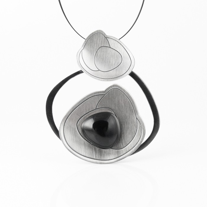 Sterling silver and jet necklace with a 43 cm long three-strand-steel cord and silver clasp. Pendant dimensions: 5.7 cm in width x 6.6 cm in length. Approximate weight: 16.9 g.