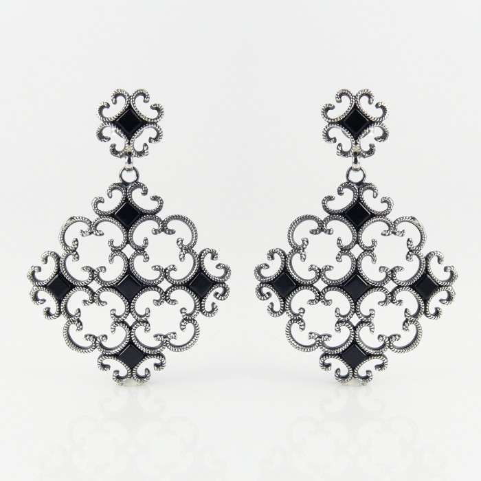 Sterling silver and jet earrings clasped by a butterfly nut at the back. Dimensions: 3.5 cm in width x 5.2 cm in length.