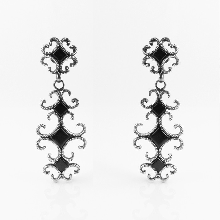 Sterling silver and jet earrings clasped by a butterfly nut at the back. Dimensions: 1.5 cm in width x 4.5 cm in length.