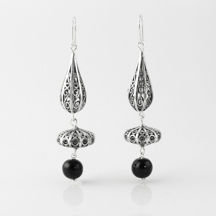 Sterling silver and jet earrings. Dimensions: 1.4 cm in width x 7.5 cm in length. One earring approximate weight: 7.9 g.