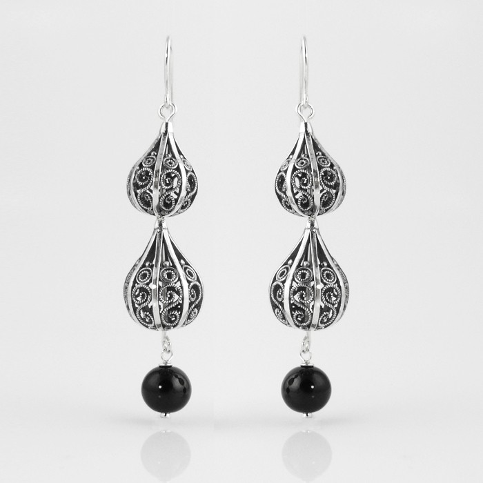 Sterling silver and jet earrings. Dimensions: 1.8 cm in width x 7 cm in length. One earring approximate weight: 7.4 g.