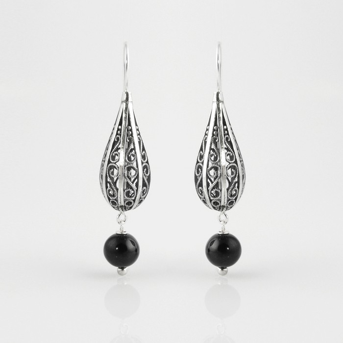 Sterling silver and jet earrings. Dimensions: 1 cm in width x 5.8 cm in length. One earring approximate weight: 4.6 g.
