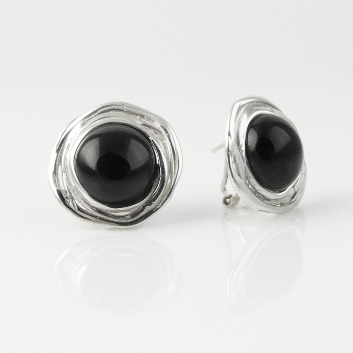 Sterling silver and jet earrings with omega clasp. Dimensions: 2 cm in diameter. One earring approximate weight: 5.4 g.