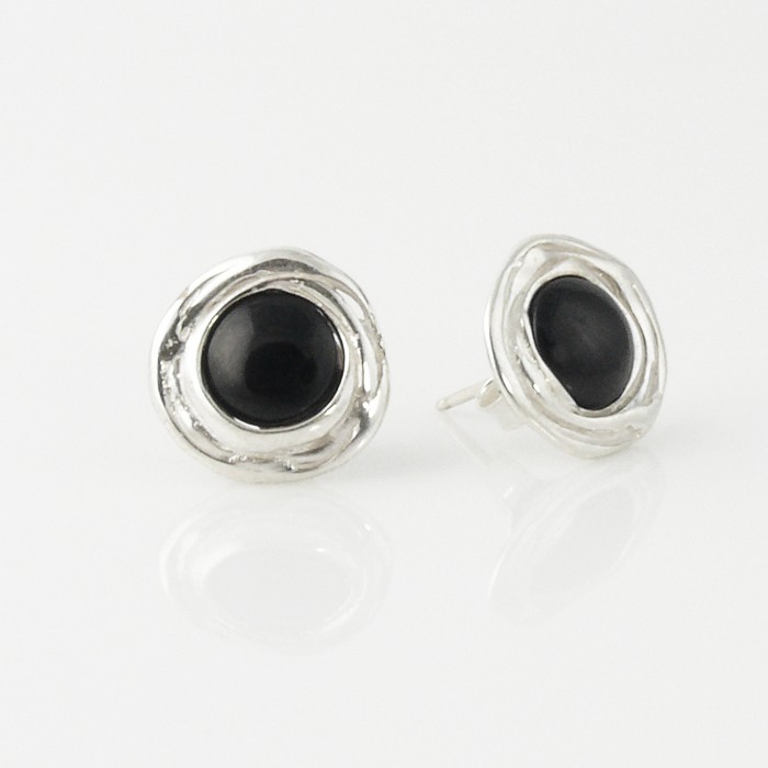 Sterling silver and jet earrings clasped by a butterfly nut at the back. Dimensions: 1.4 cm in diameter. One earring approximate weight: 1.8 g.