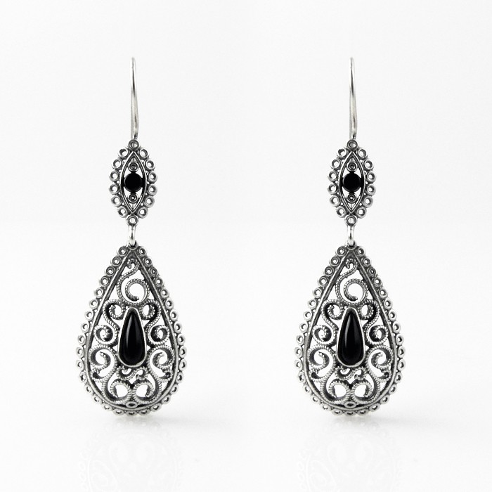 Sterling silver and jet earrings. Dimensions: 2.9 cm in width x 5.8 in length. Each earring approximate weight: 3.8 g.