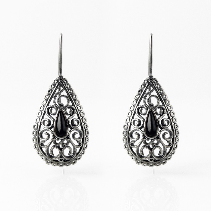 Sterling silver and jet earrings. Dimensions: 1.8 cm in width x 4.2 in length. Each earring approximate weight: 3.1 g.