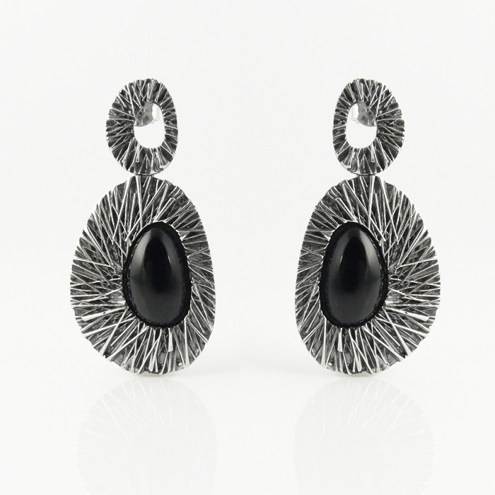 Sterling silver and jet earrings clasped by a butterfly nut at the back. Dimensions: 2.3 cm in width x 4.5 cm in length. One earring approximate weight: 20.1 g.