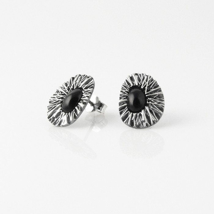 Sterling silver and jet earrings clasped by a butterfly nut at the back. Dimensions: 1.2 cm in width x 1.6 cm in length. One earring approximate weight: 1.8 g.