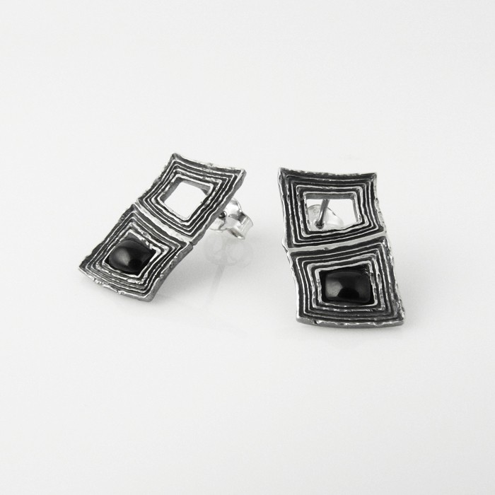 Sterling silver and jet earrings clasped by a butterfly nut at the back. Dimensions: 1.6 cm in width x 2 cm in length. One earring approximate weight: 2.2 g.