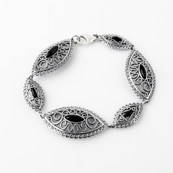 Sterling silver and jet bracelet. Dimensions: 1.8 cm in width x 19 cm in length. Approximate weight: 12.8 g.