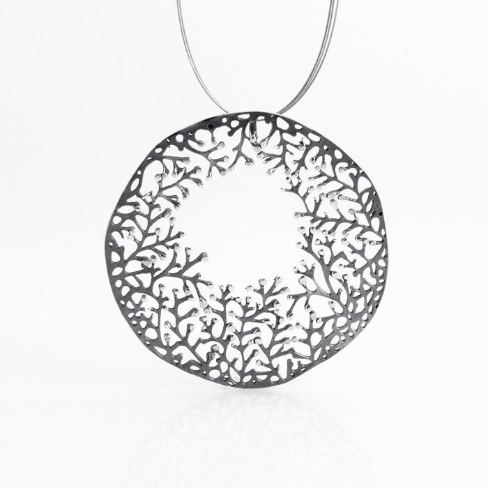 Gargantilla de plata de ley con triple cordón de hilo de acero de 45 cm de largo y terminales de plata. Dimensiones: 6 cm de diámetro. Peso aproximado: 15.9 g.