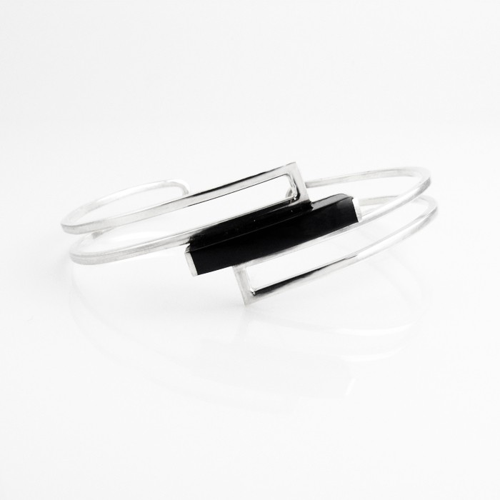 Brazalete de plata de ley y azabache hecho a mano. Dimensiones: 1.9 cm de ancho x 6.5 cm de diámetro. Peso aproximado: 10.8 g.