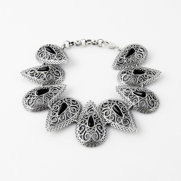 Pulsera en plata de ley y azabache. Dimensiones: 3 cm de ancho x 21 cm de largo. Peso aproximado: 27.3 g.