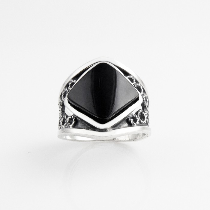 Anillo de plata y azabache hecho a mano. Dimensiones: 1.8 cm de ancho. Peso aproximado: 4.7 g.